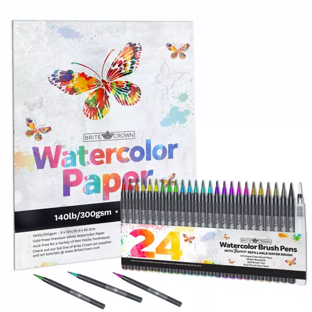 • 24 vibrant watercolor pen markers: A complete palette of colors to suit all your artistic needs, from soft pastels to bold primaries.