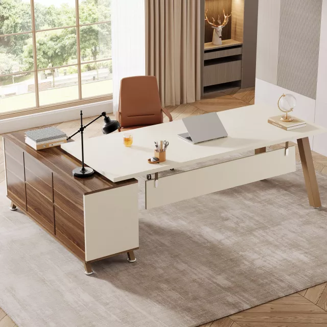 Built with a sturdy metal frame and E0-grade board, this executive desk provides reliable support for your computer, accessories, and files. The scratch-resistant finish keeps your workspace looking new, even with daily use. The included 55-inch cabinet offers two smooth drawers for letter-size files, plus four open shelves ideal for books, décor, or essential supplies.