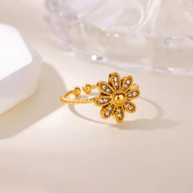 Crafted from durable stainless steel and finished with radiant 18K gold plating, this ring offers long-lasting shine and strength. The daisy design is highlighted by a sparkling zircon inlay, giving it a bright, eye-catching glow. With its adjustable open-band style, it provides a comfortable and flexible fit for daily use. The geometric floral pattern paired with a smooth bezel setting creates a modern yet delicate aesthetic that suits a variety of styles and outfits.
