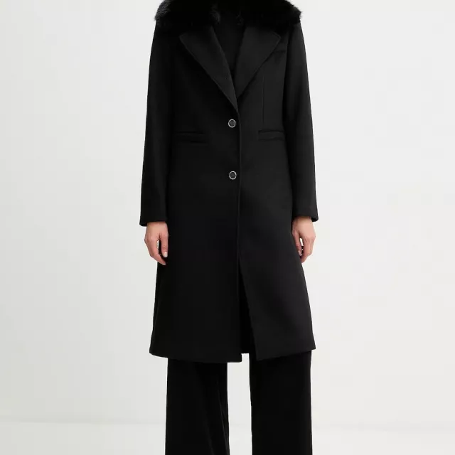 This coat is the ideal choice for chilly weather, whether you’re dressing for a casual day out or a more formal occasion. The combination of wool and polyester ensures you stay warm, comfortable, and stylish. The front pockets not only add a touch of utility but also help keep your hands warm on those brisk mornings. The timeless black color and button fastening give the coat a classic, sophisticated look that never goes out of style.