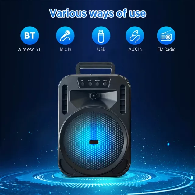 Turn any space into a music festival with this 6.5-inch portable Bluetooth speaker. Designed to deliver deep, punchy bass and crystal-clear highs, it’s perfect for backyard BBQs, beach parties, camping trips, or indoor gatherings. With its dynamic LED light show, your music comes alive, creating a club-like atmosphere that keeps the energy high all night long.