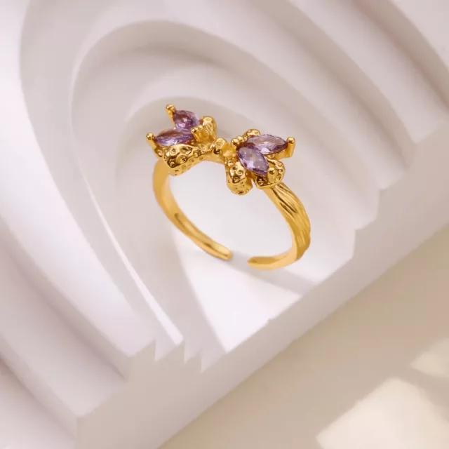 Graceful, feminine, and full of sparkle, this Purple Zircon Butterfly Ring is designed for women who love jewelry that feels both elegant and expressive. Crafted from durable stainless steel and finished in radiant 18k gold plating, it brings a luxurious touch to your everyday style without losing its modern, trendy charm. The geometric butterfly shape adds a whimsical yet sophisticated feel, making it a standout accessory for any occasion.