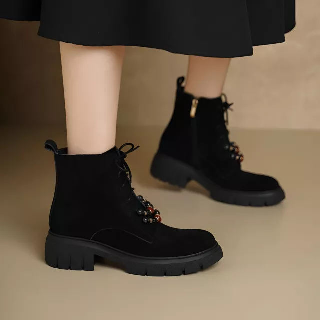 These boots are more than just stylish – they are built to last. The soft cow suede exterior adds a touch of sophistication, while the rubber outsole ensures you have the traction needed to keep you steady in winter conditions. The cross-tied design is a nod to retro fashion, allowing you to express your personal style effortlessly. The square heel offers the right amount of height and stability, making these boots perfect for both everyday wear and special occasions.