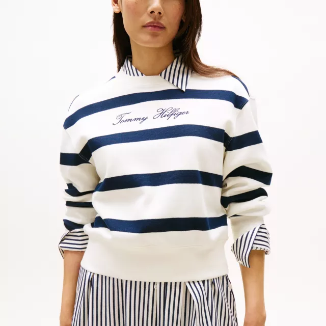 Embrace style and sustainability this season with the Tommy Hilfiger Women’s Striped Organic Cotton Sweatshirt. Add it to your wardrobe today for a perfect mix of comfort, style, and eco-conscious fashion.