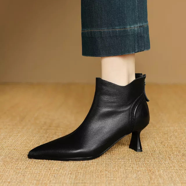 Winter Pointed-Toe Leather Ankle Boots with Sleek Kitten Heel
