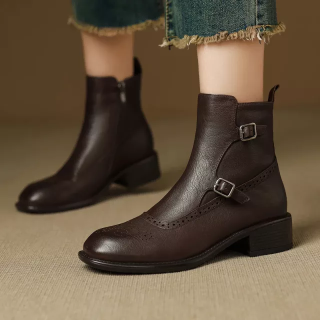 Women’s Buckle Chelsea Boots – Handmade Genuine Leather, Round Toe, Low Heel Ankle Boots
